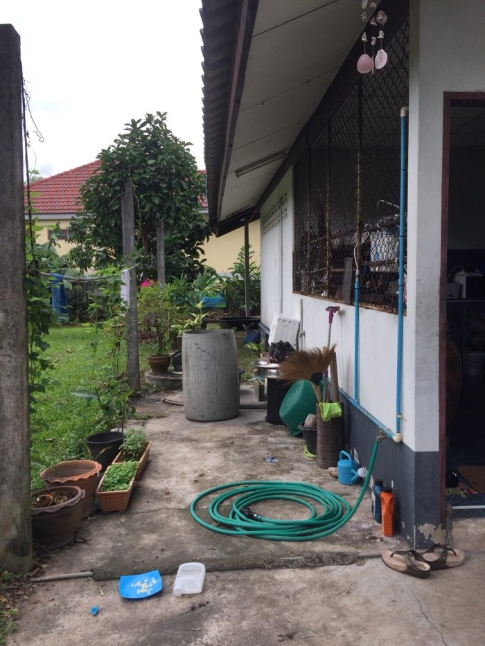 **มุงหลังคาและปูกระเบื้องในส่วนของครัวหลังบ้าน